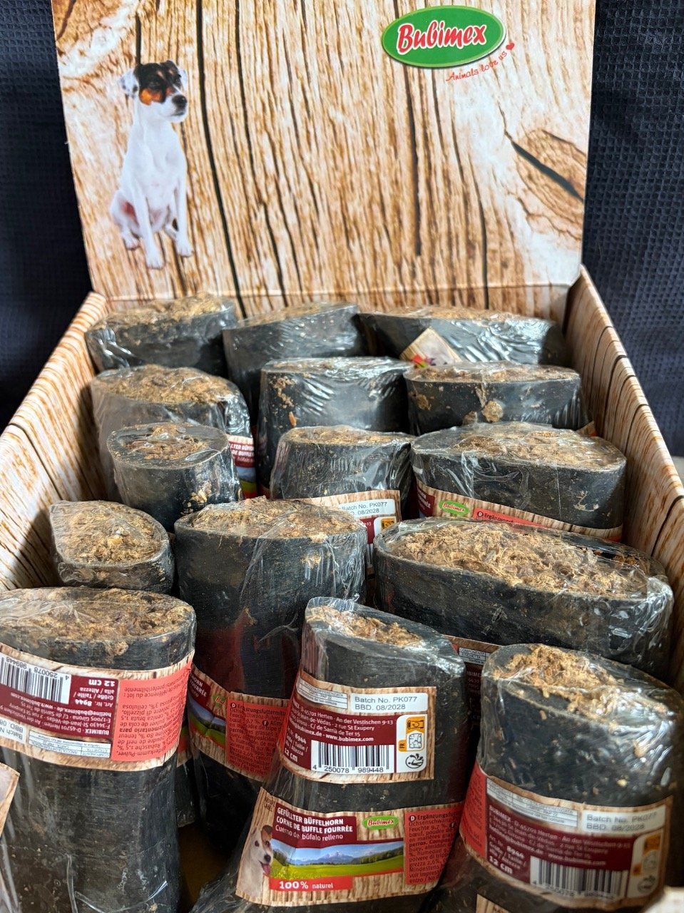 100% corne de buffle remplie de farce savoureuse composée de 45% de viande de bœuf, 30% de sous-produits animaux, 15% de protéines végétales et 10% d'arômes naturels.